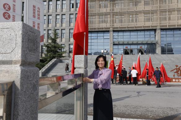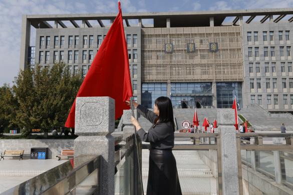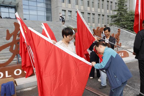 机关党总支全体党员有序地将红旗安装到教学楼、实验楼、泮池等地两旁的旗杆上,仔细调整每一面国旗的角度和位置,确保整齐划一、美观大方。